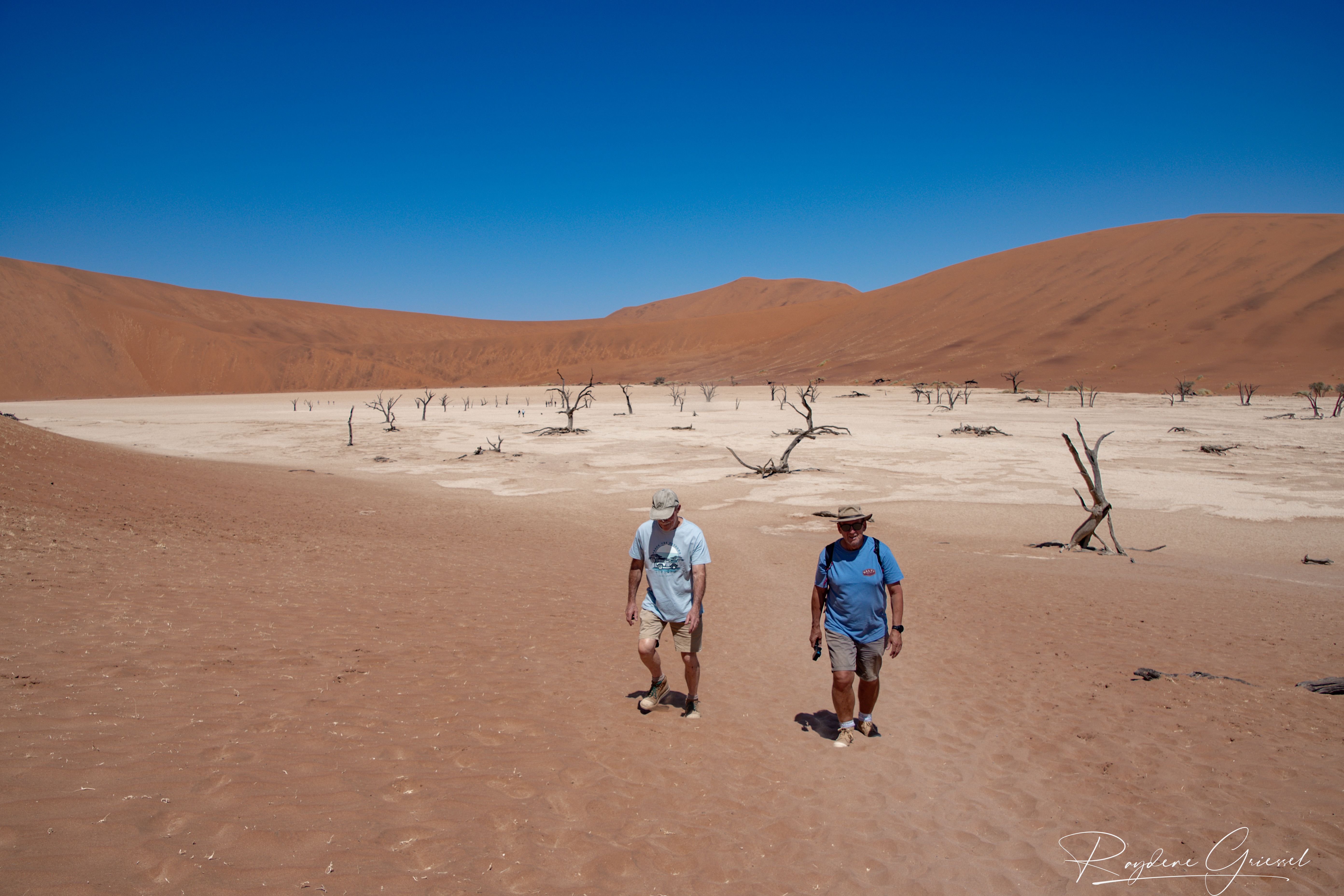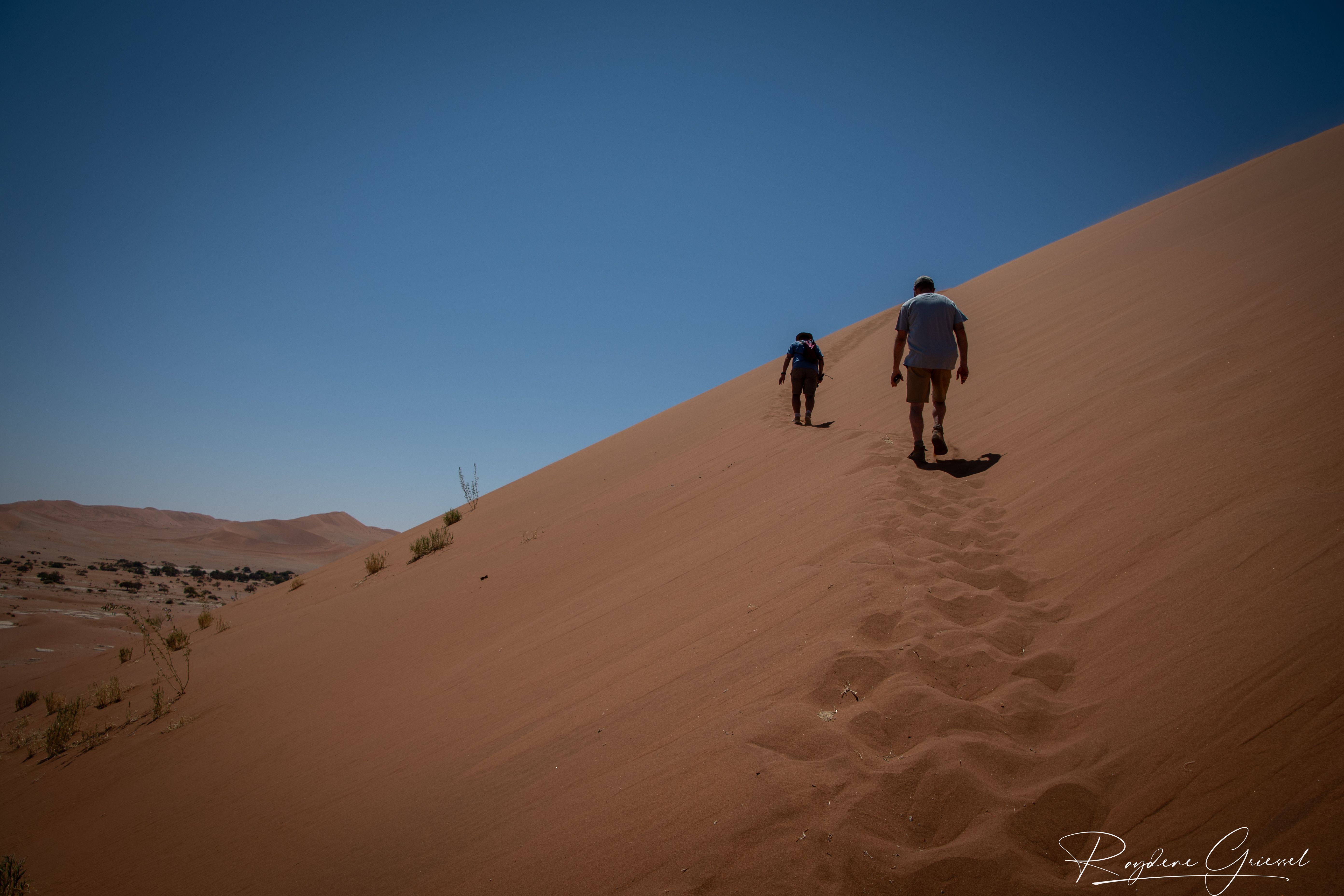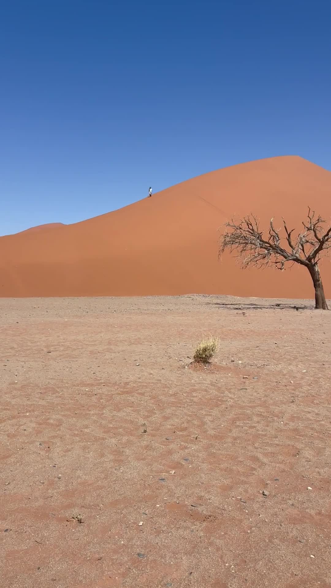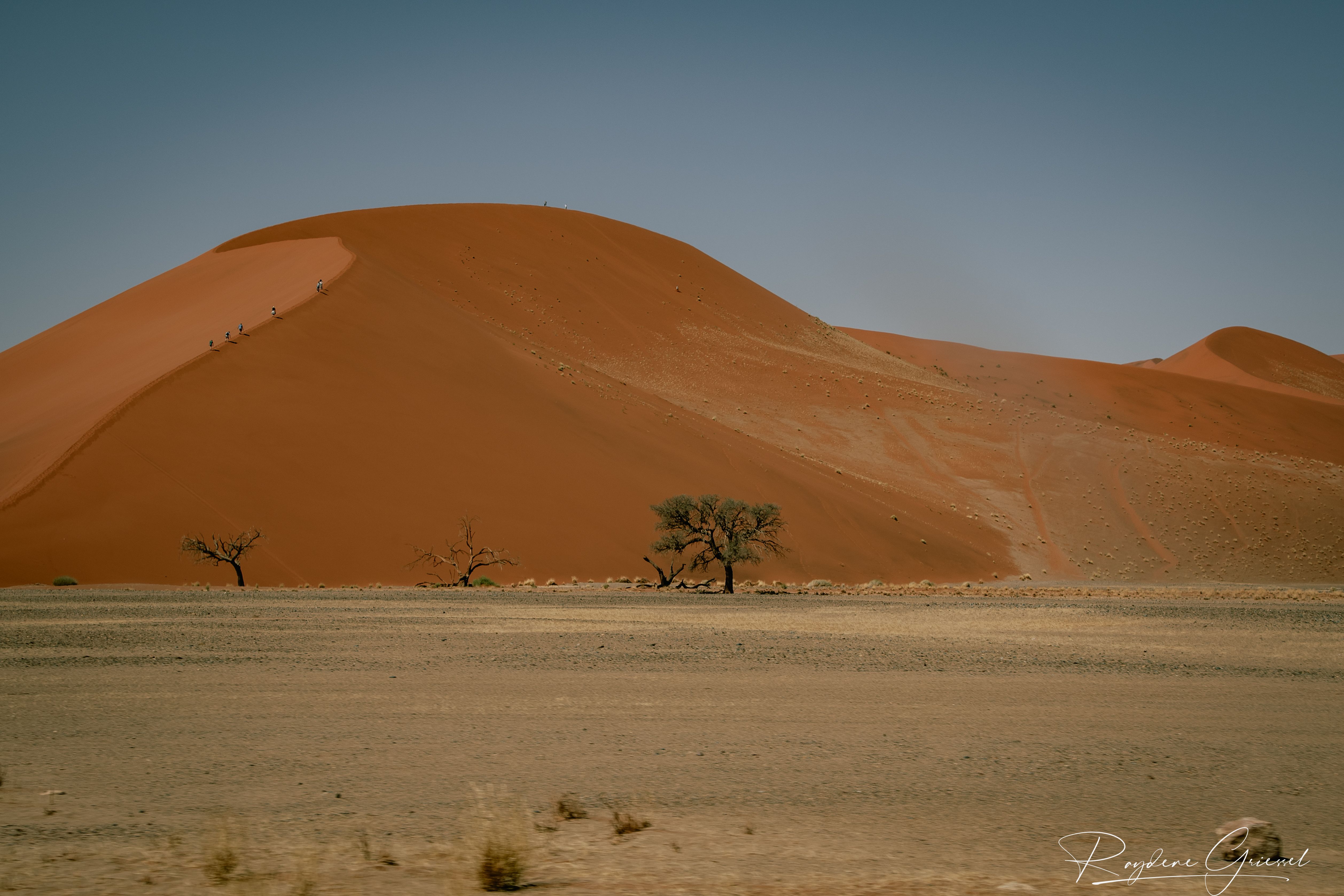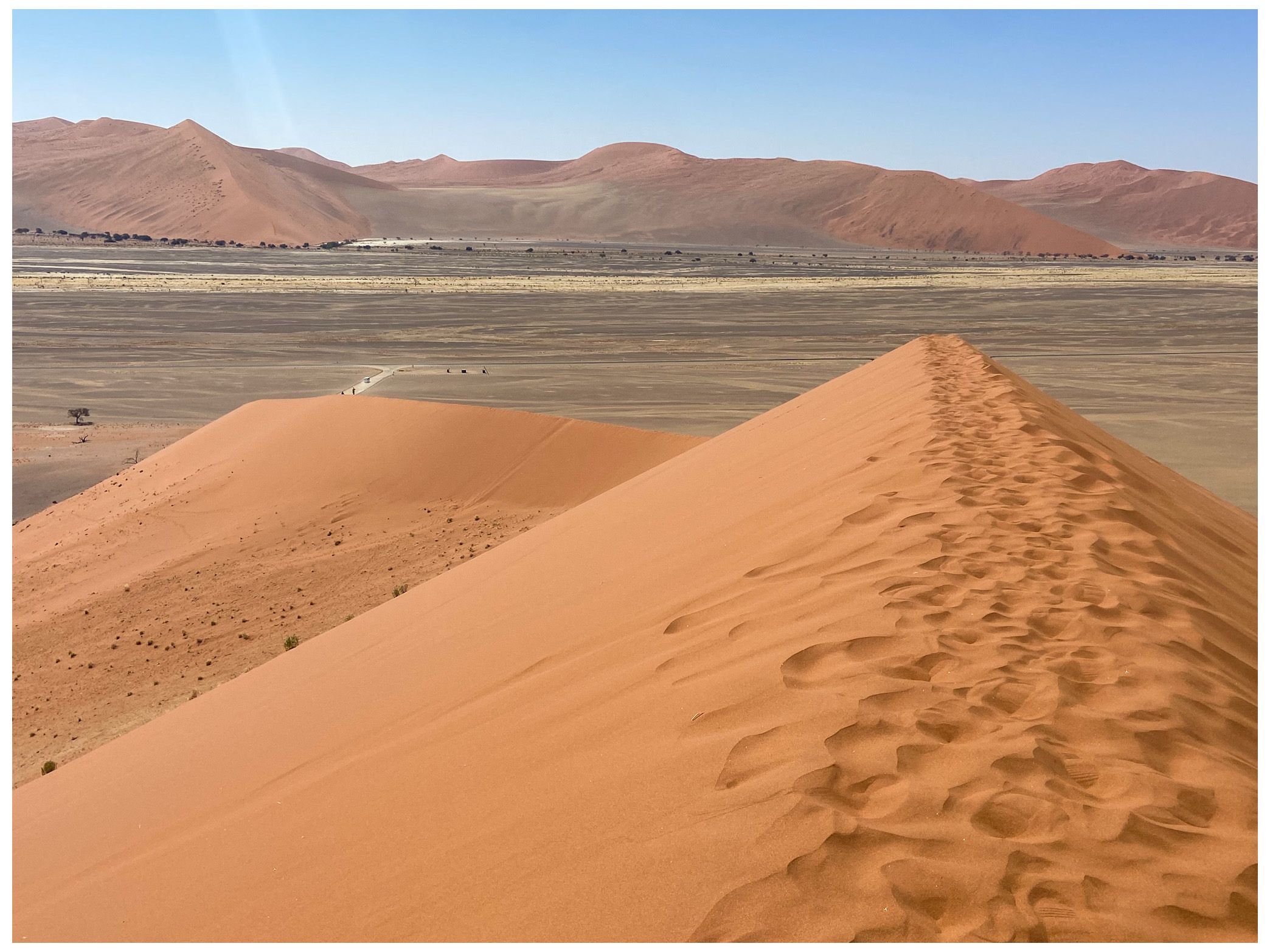On our return, Mike & Shane climbed Dune 45, a 170m star dune named for its 45km distance from Sesriem. The ascent was gruelling—sand slipping underfoot, the relentless sun and wind—but reaching the ridge felt like summiting a desert peak. The view of rolling dunes and distant mountains was worth every step.