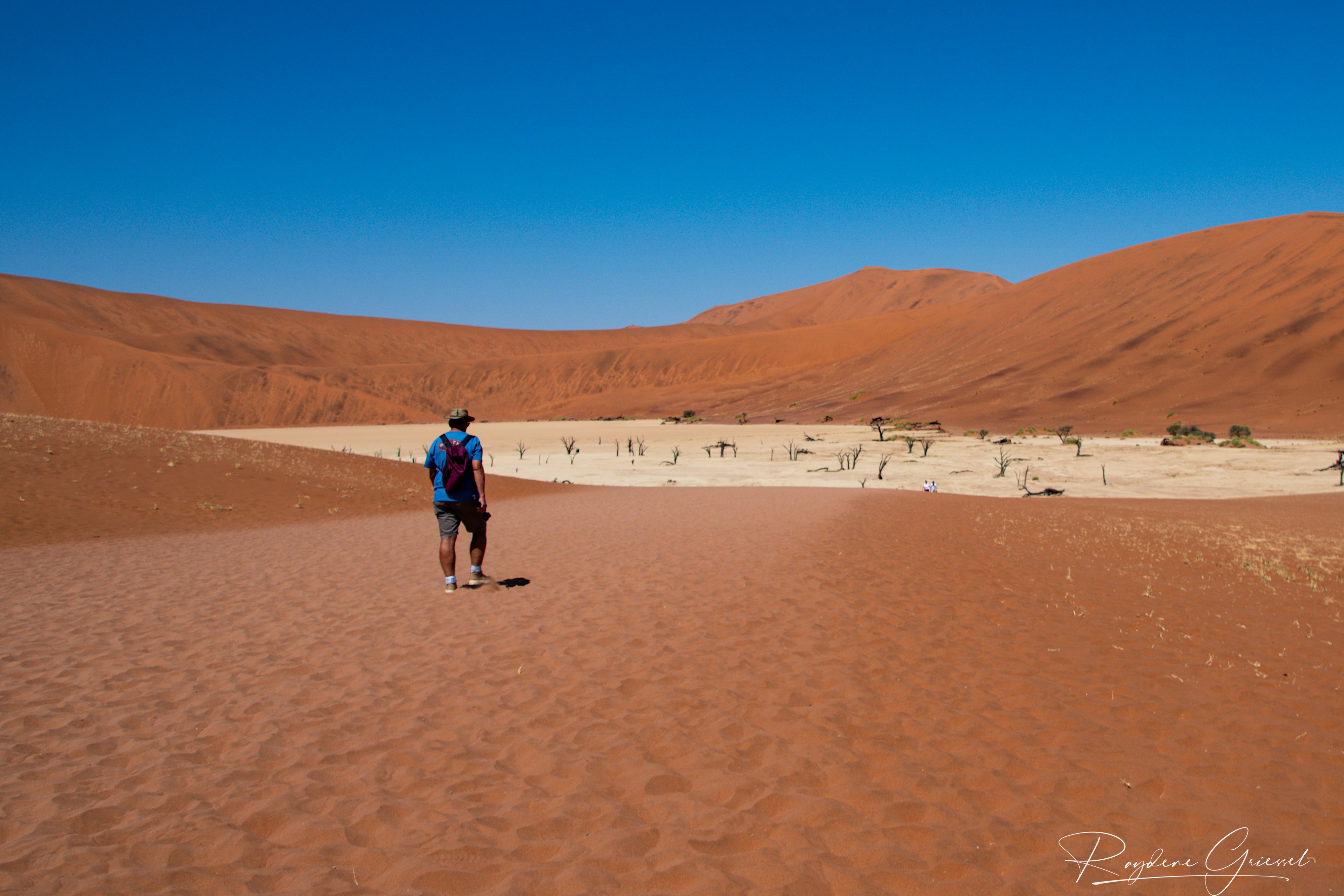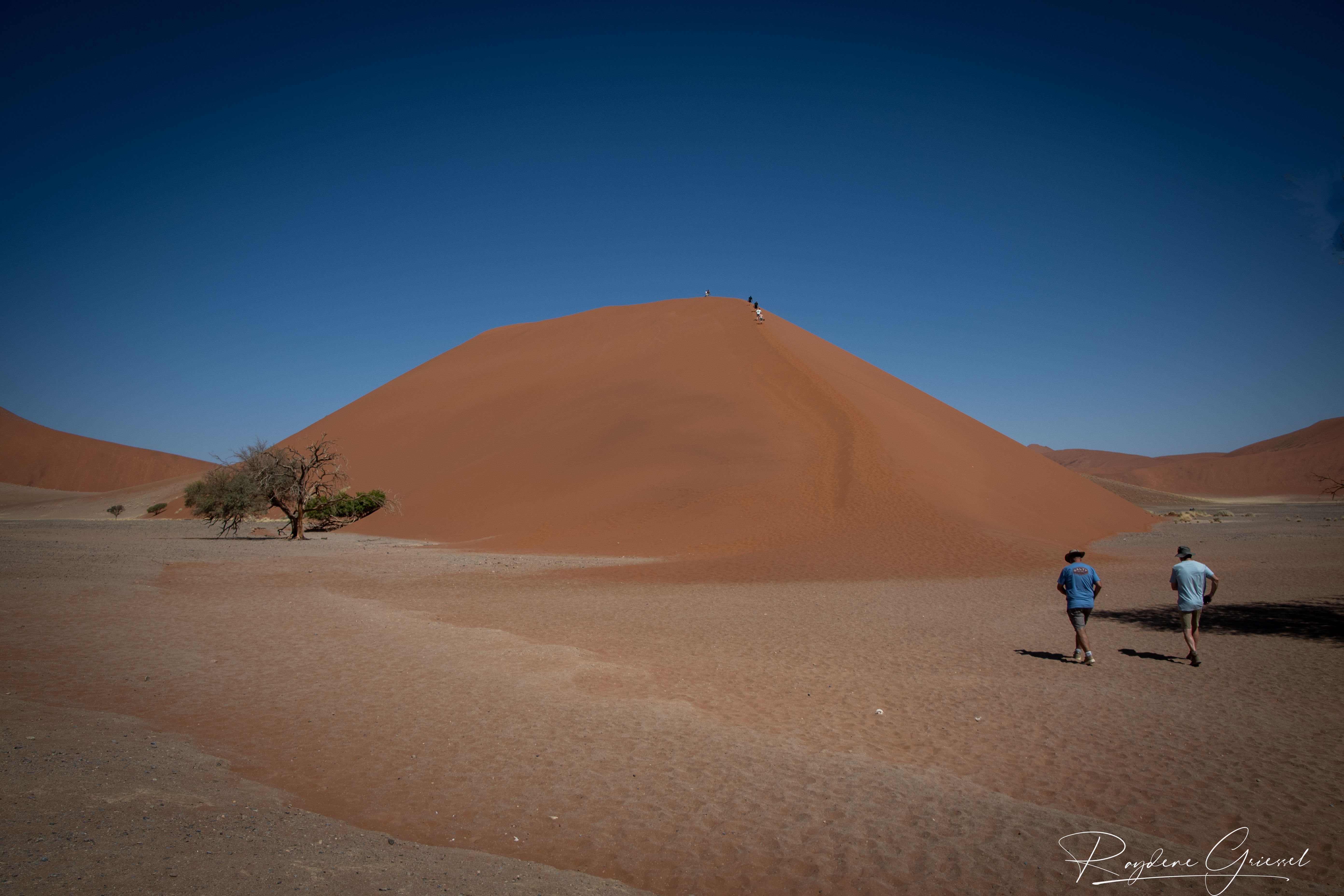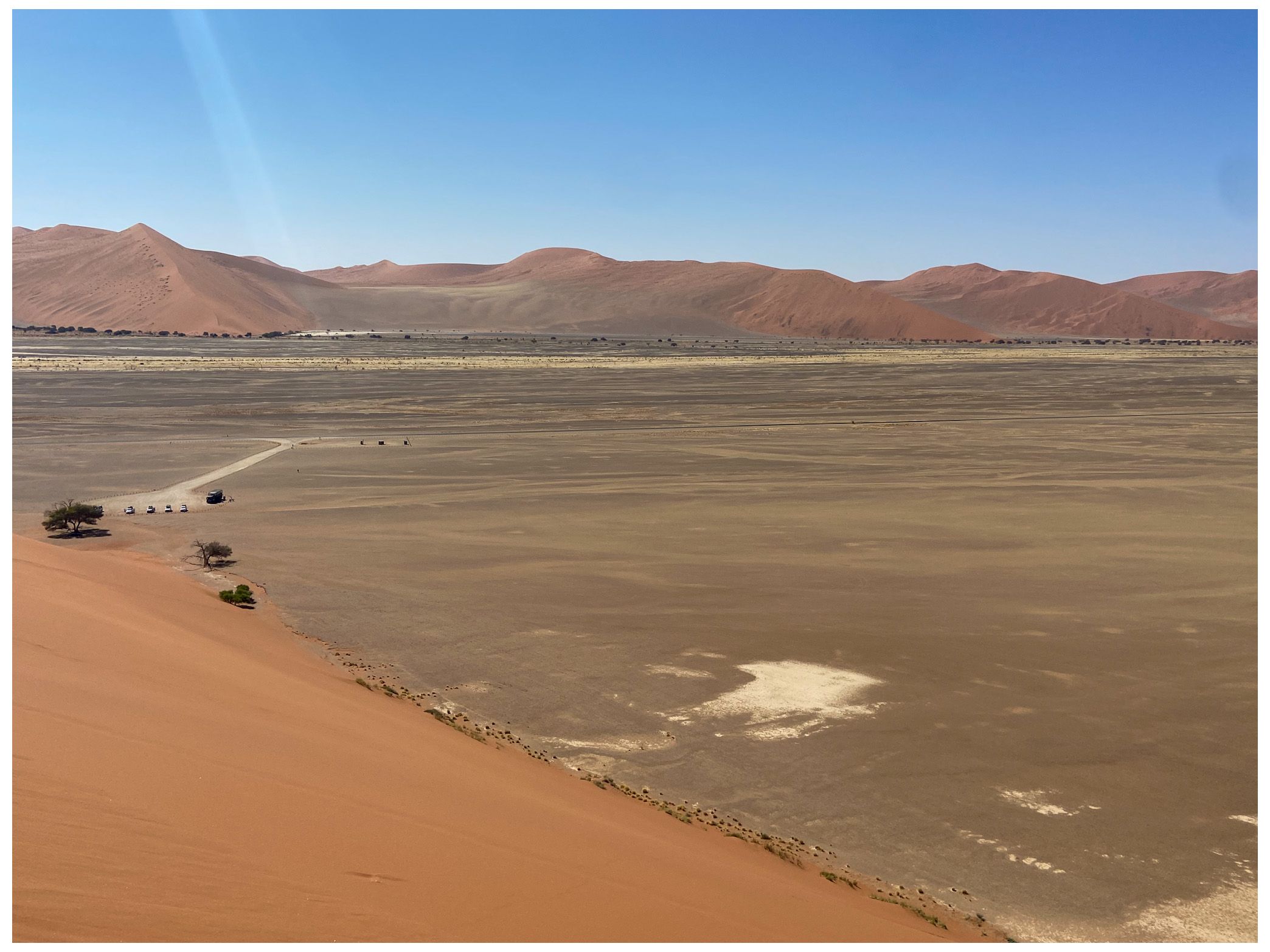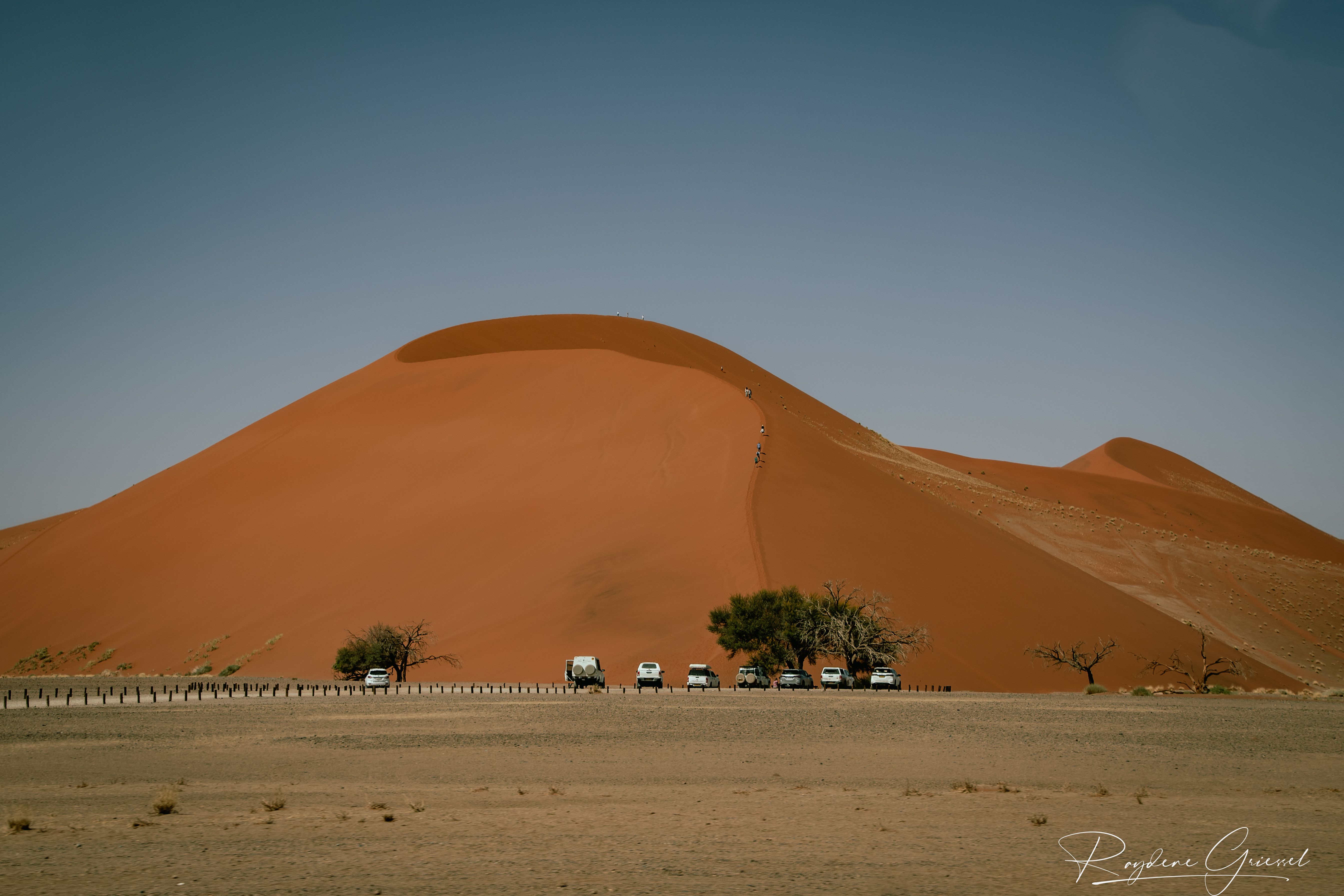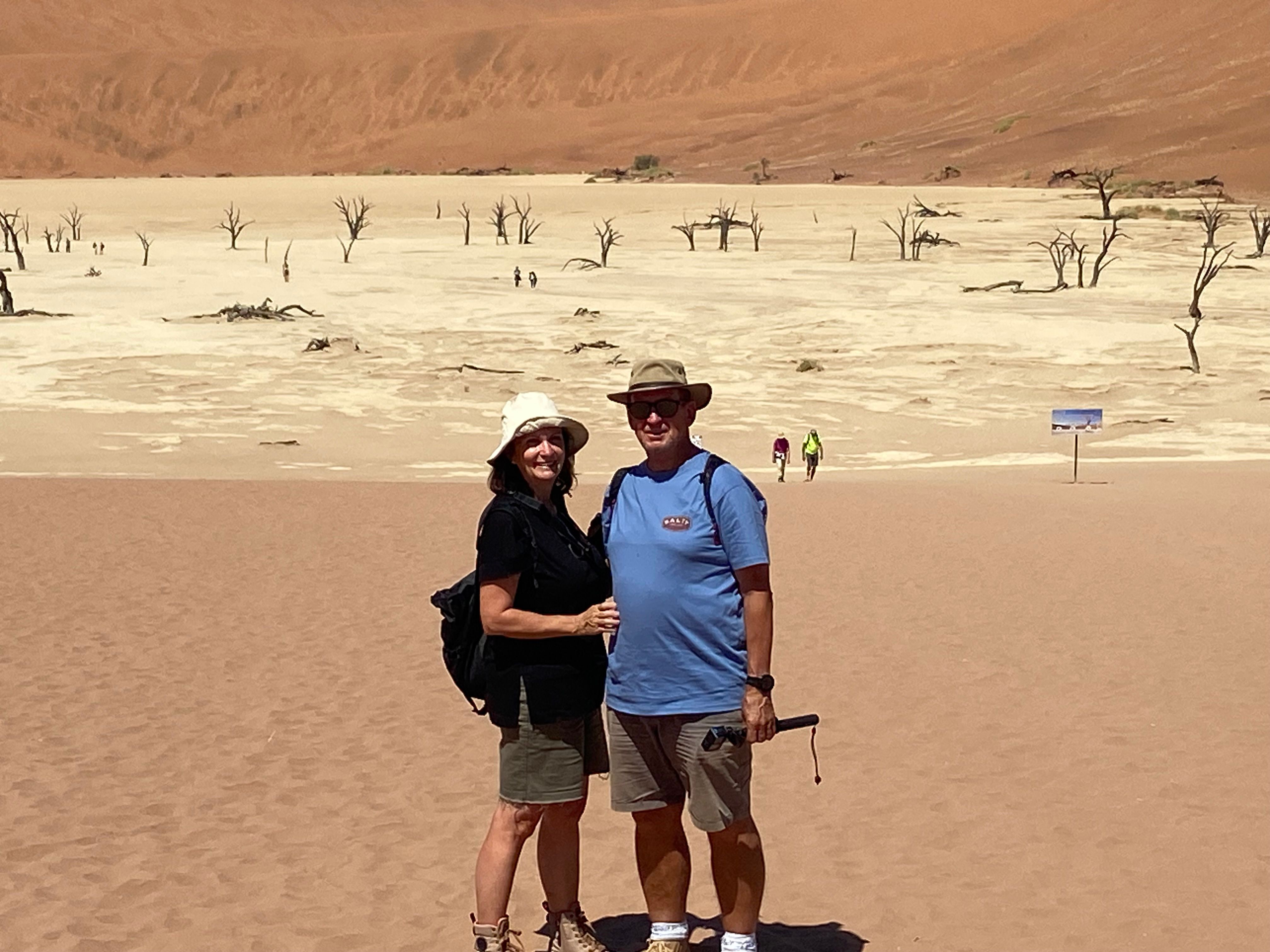 On our return, Mike & Shane climbed Dune 45, a 170m star dune named for its 45km distance from Sesriem. The ascent was gruelling—sand slipping underfoot, the relentless sun and wind—but reaching the ridge felt like summiting a desert peak. The view of rolling dunes and distant mountains was worth every step.