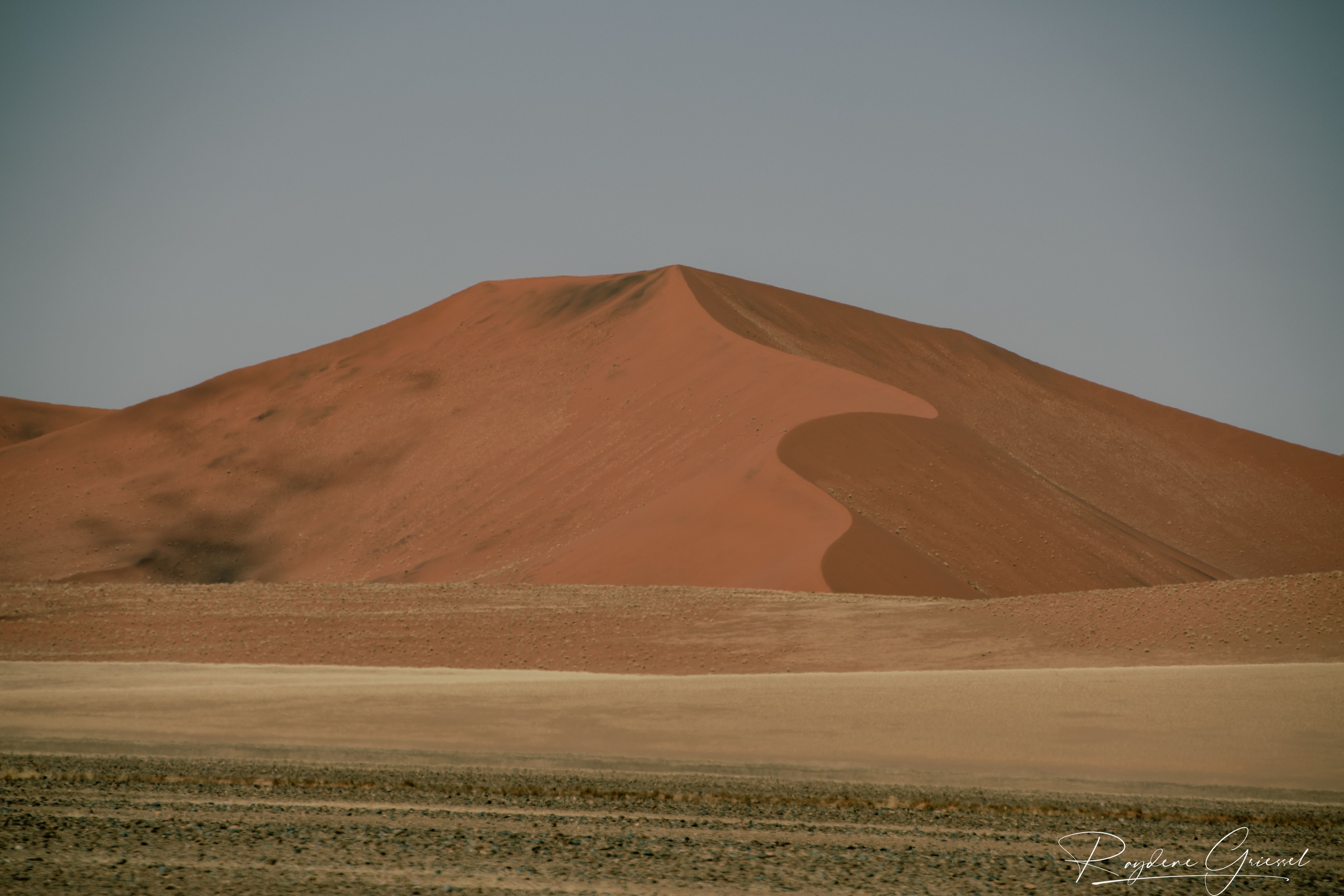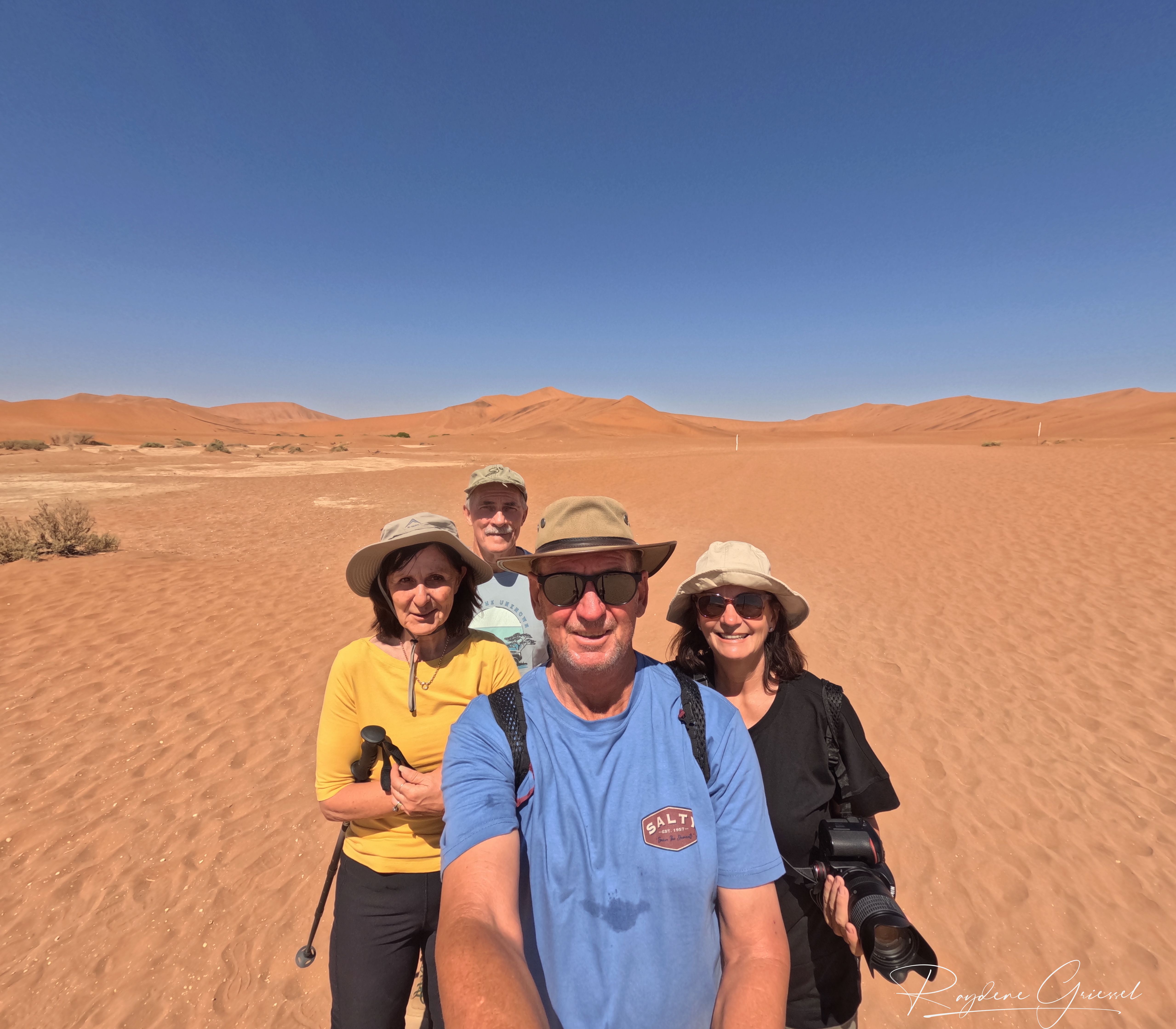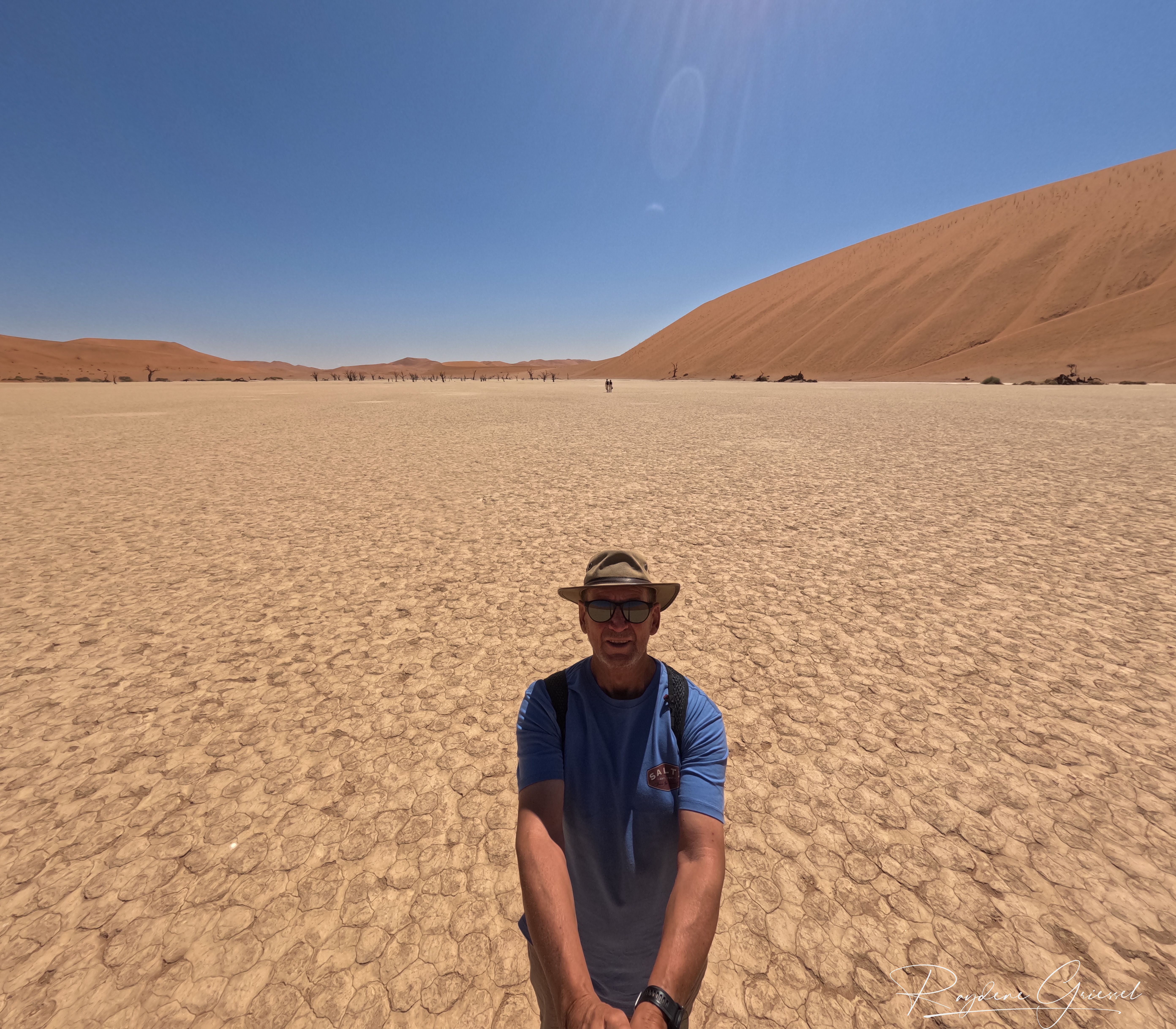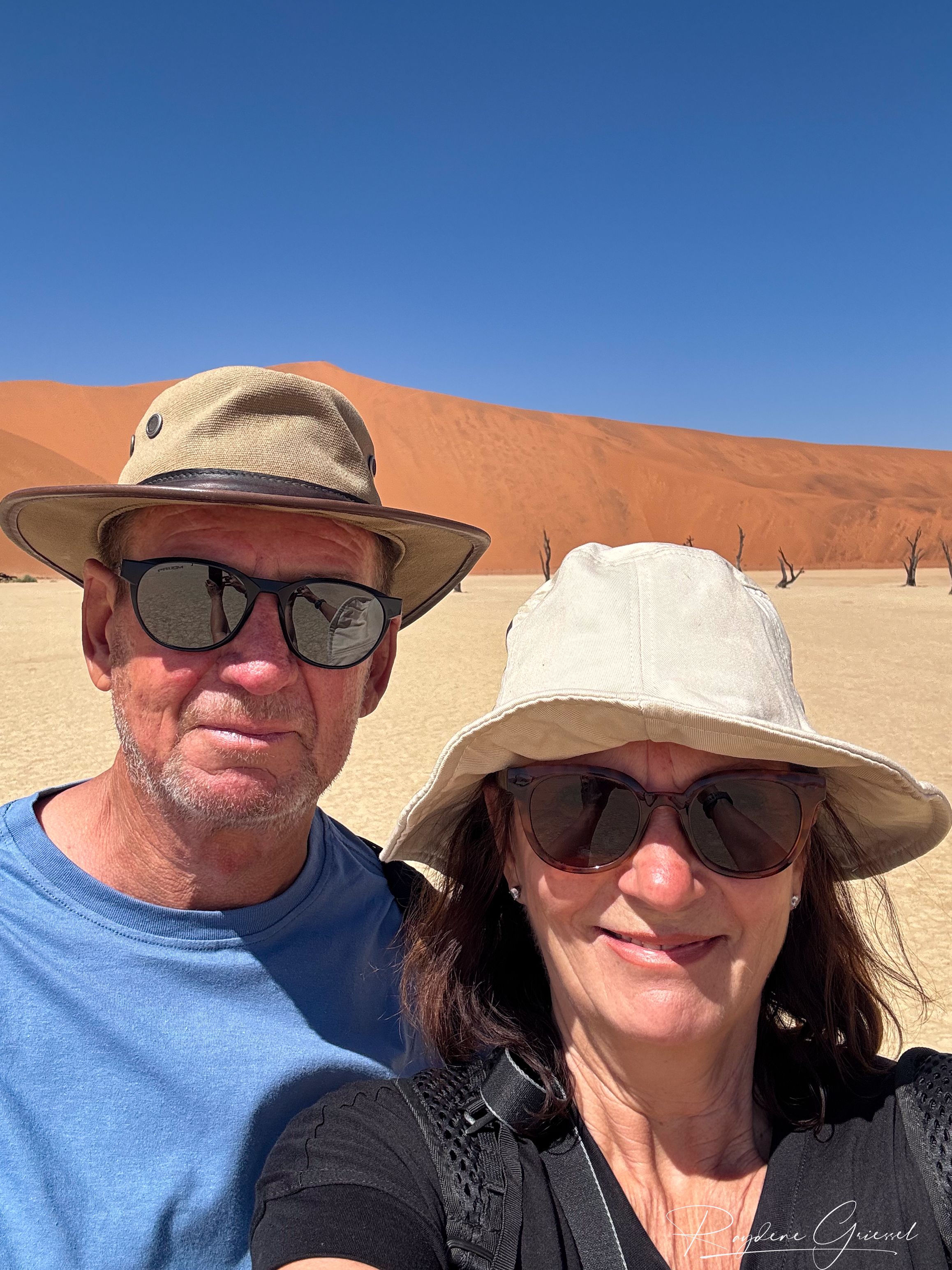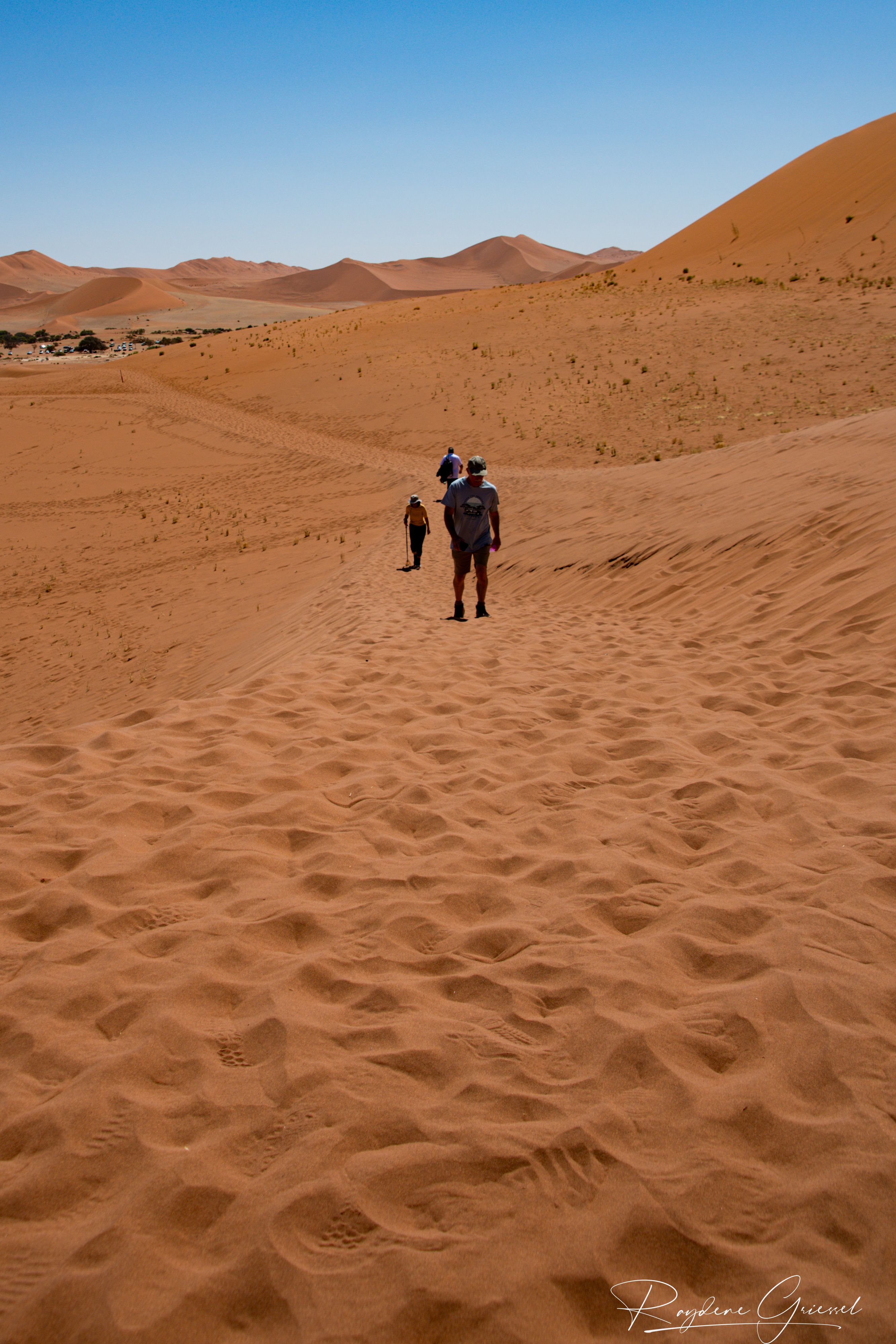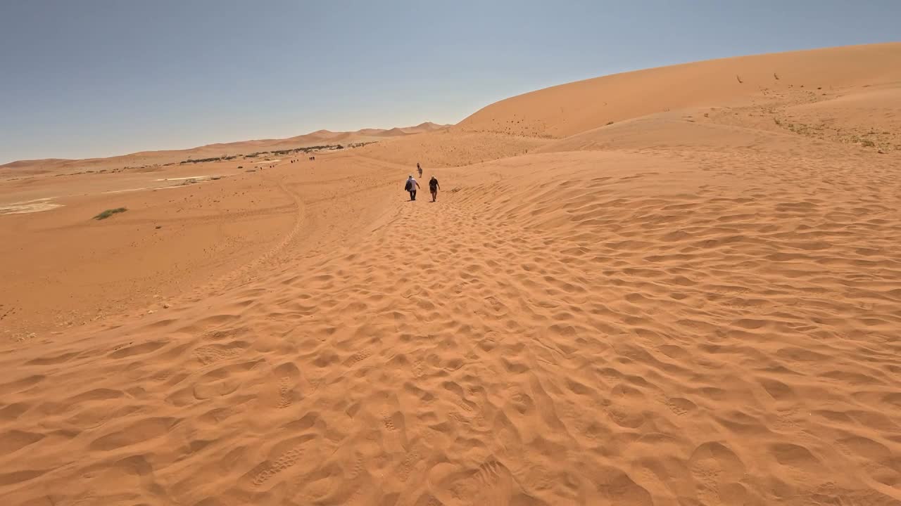 On our return, Mike & Shane climbed Dune 45, a 170m star dune named for its 45km distance from Sesriem. The ascent was gruelling—sand slipping underfoot, the relentless sun and wind—but reaching the ridge felt like summiting a desert peak. The view of rolling dunes and distant mountains was worth every step.