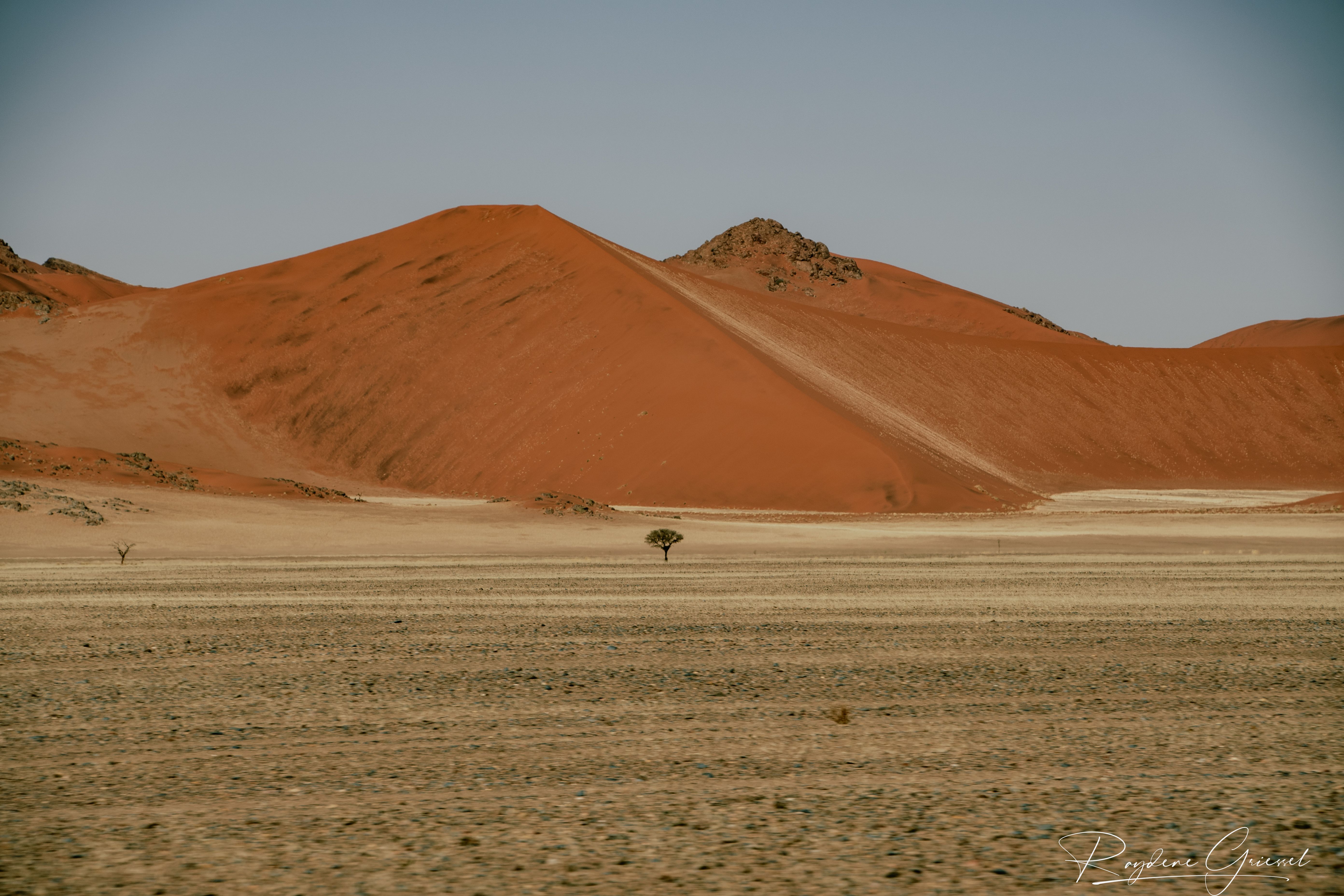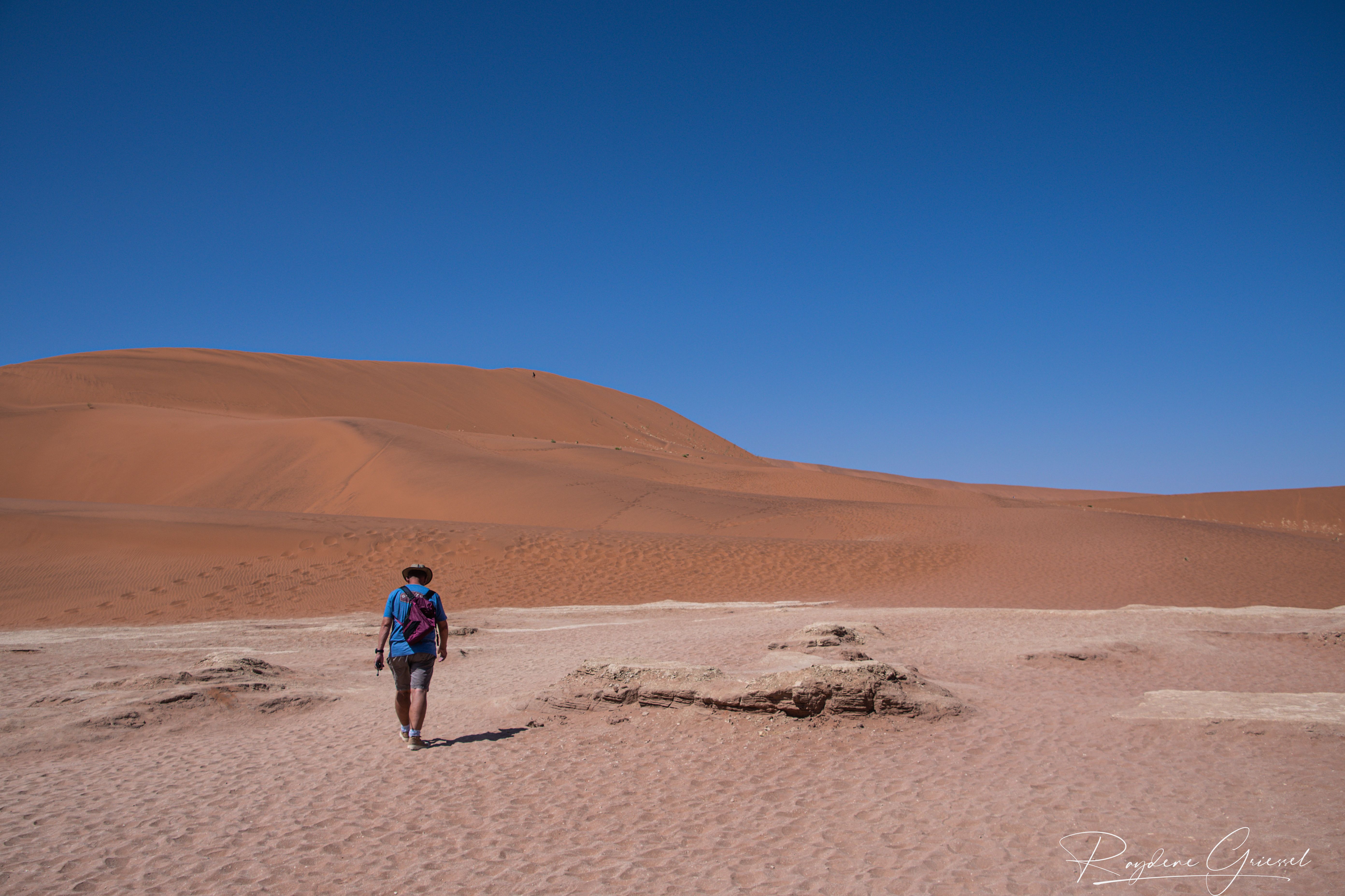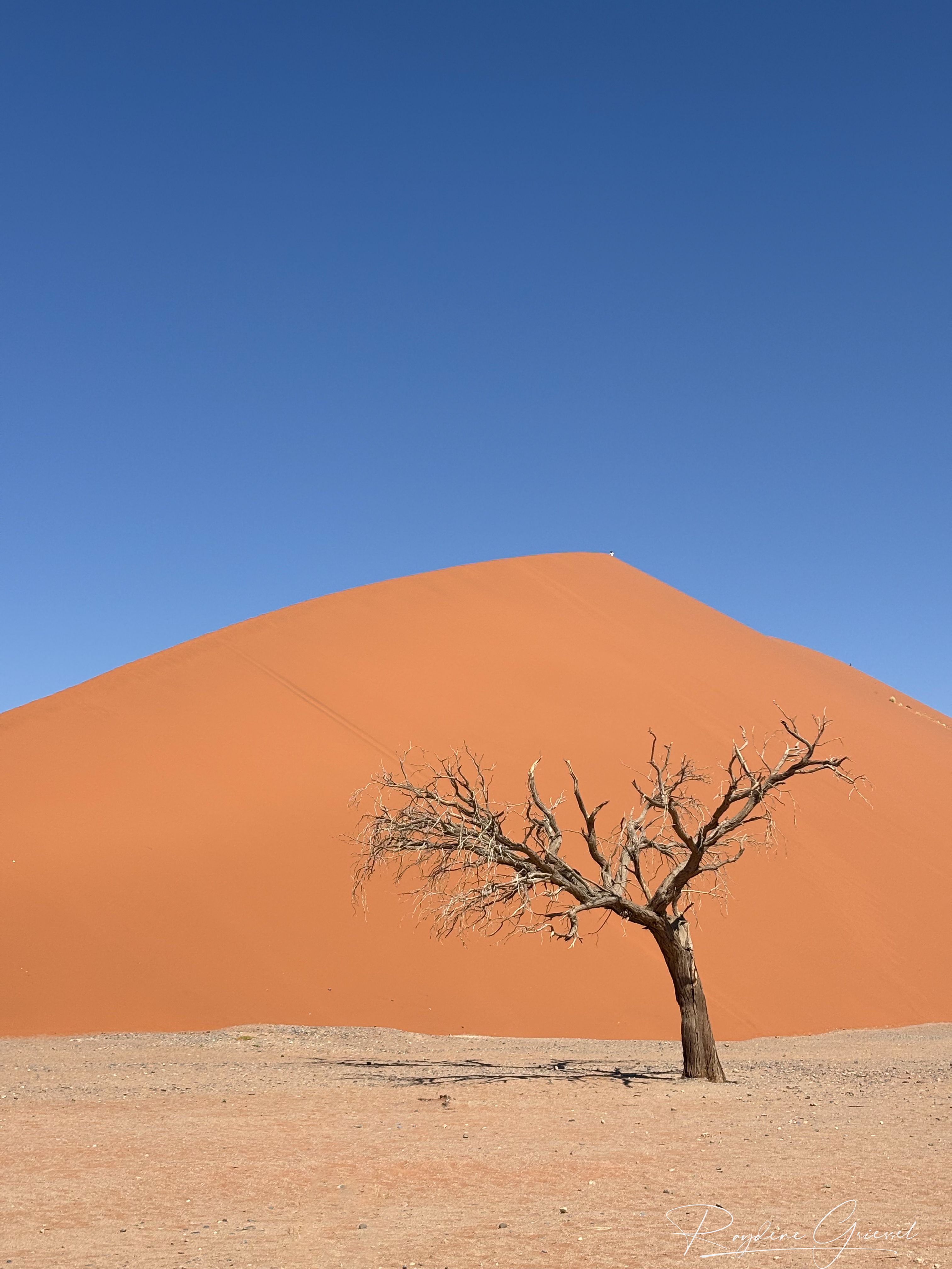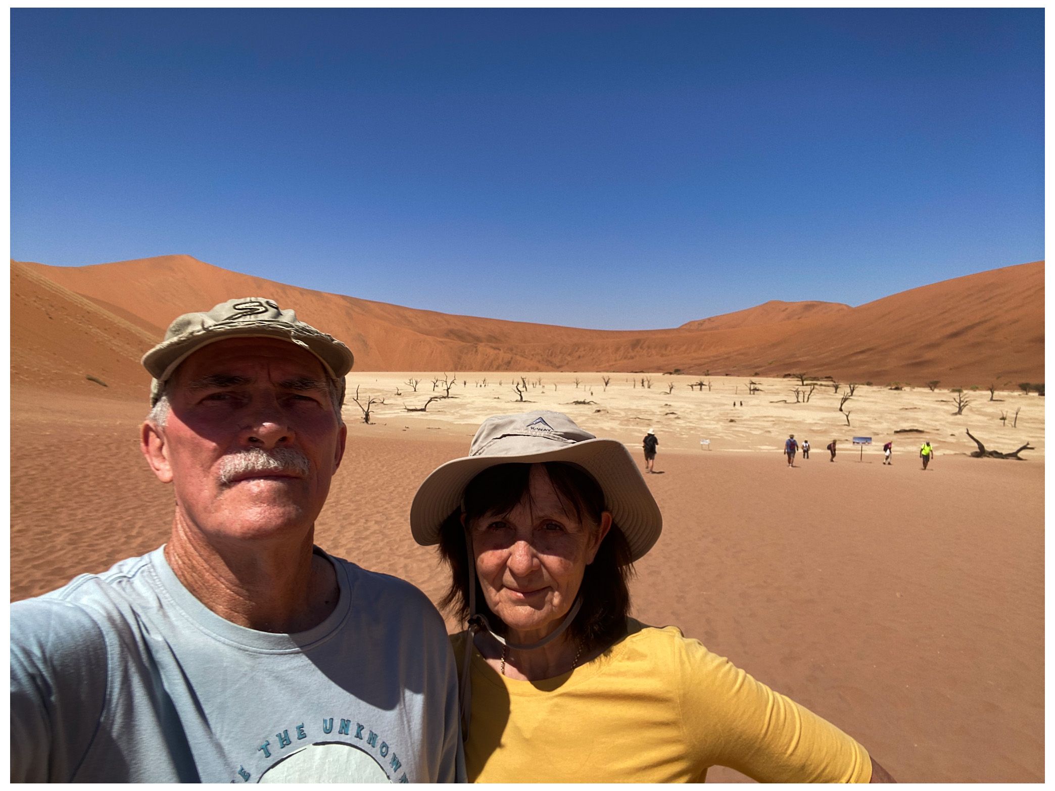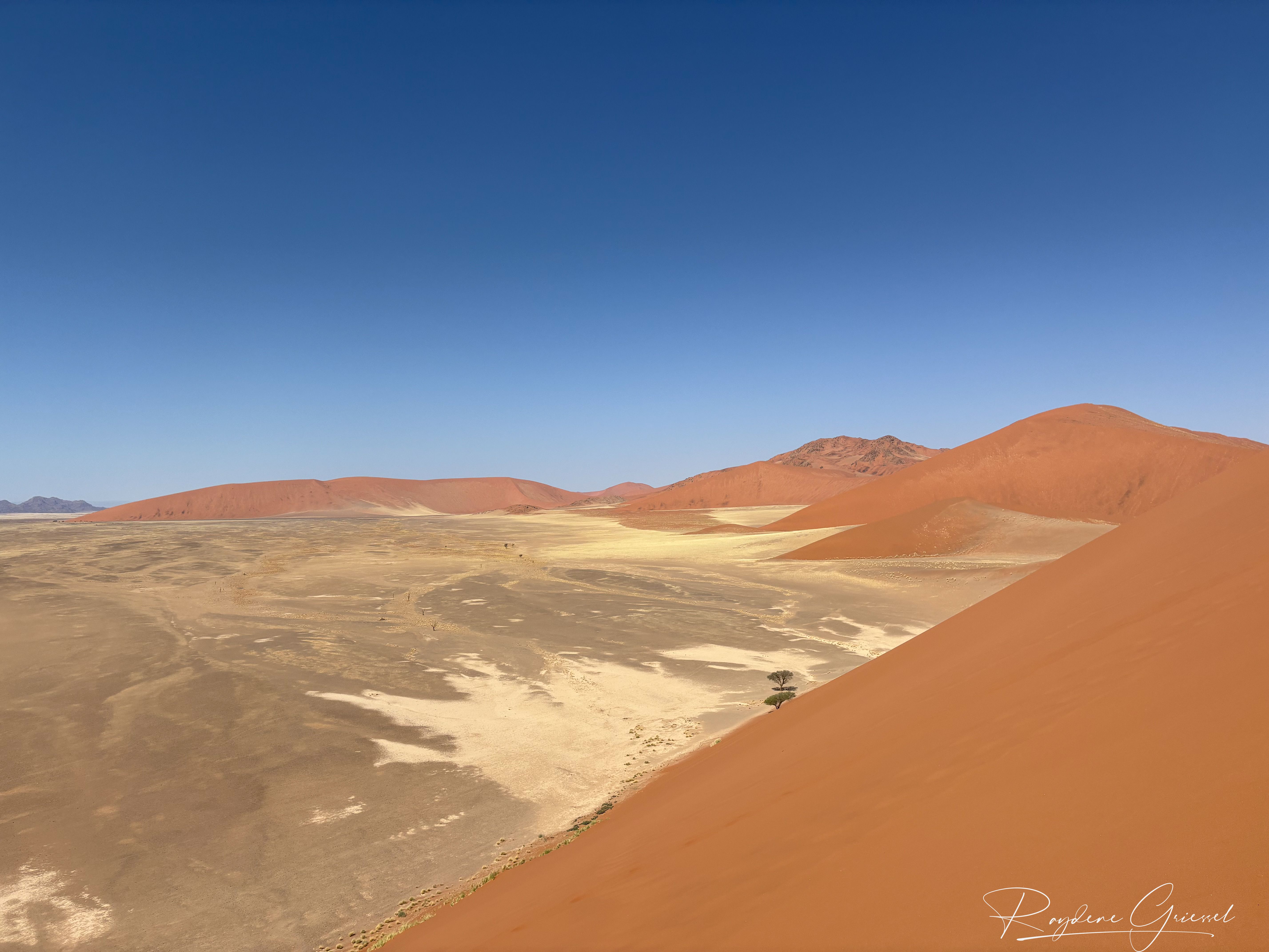 On our return, Mike & Shane climbed Dune 45, a 170m star dune named for its 45km distance from Sesriem. The ascent was gruelling—sand slipping underfoot, the relentless sun and wind—but reaching the ridge felt like summiting a desert peak. The view of rolling dunes and distant mountains was worth every step.