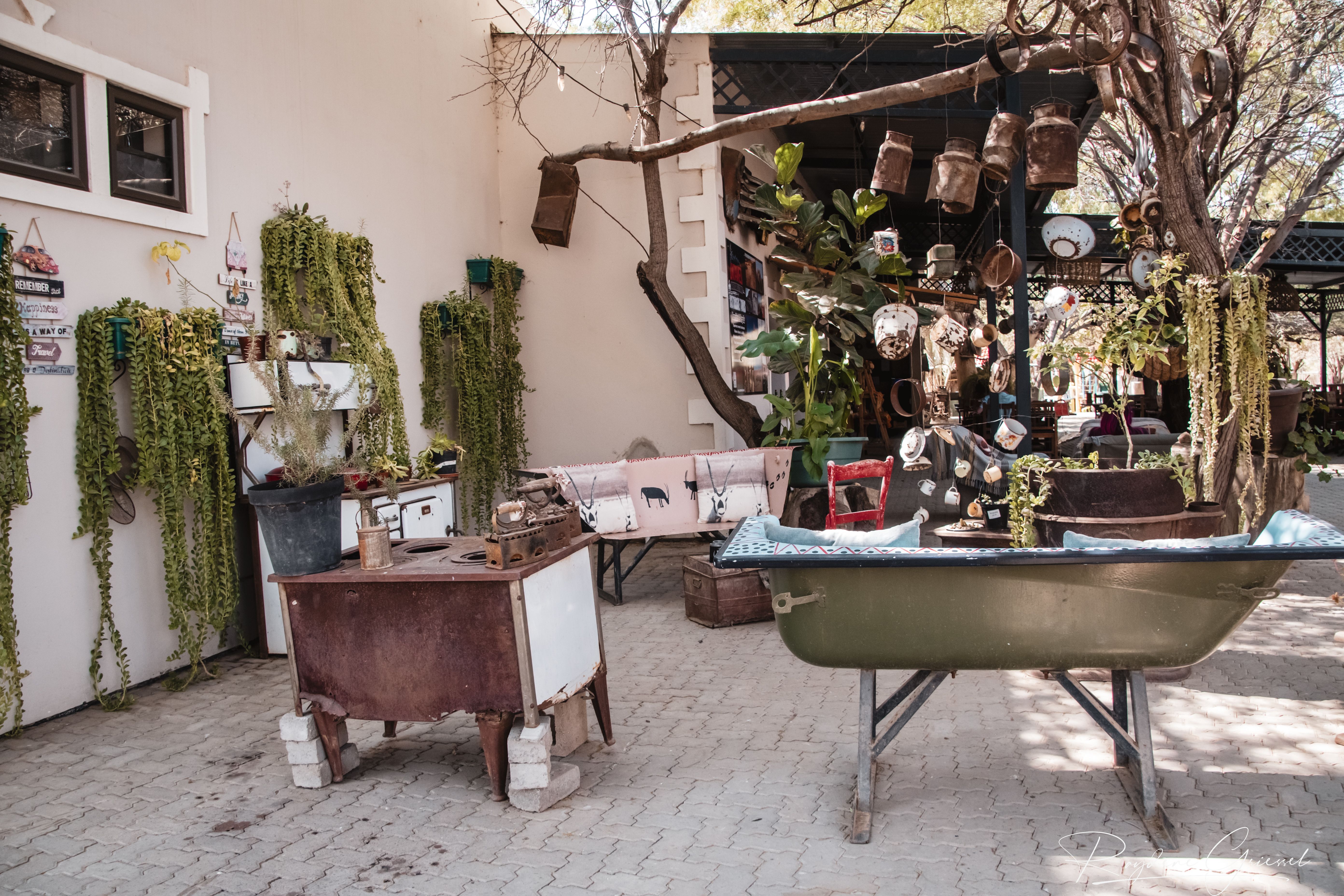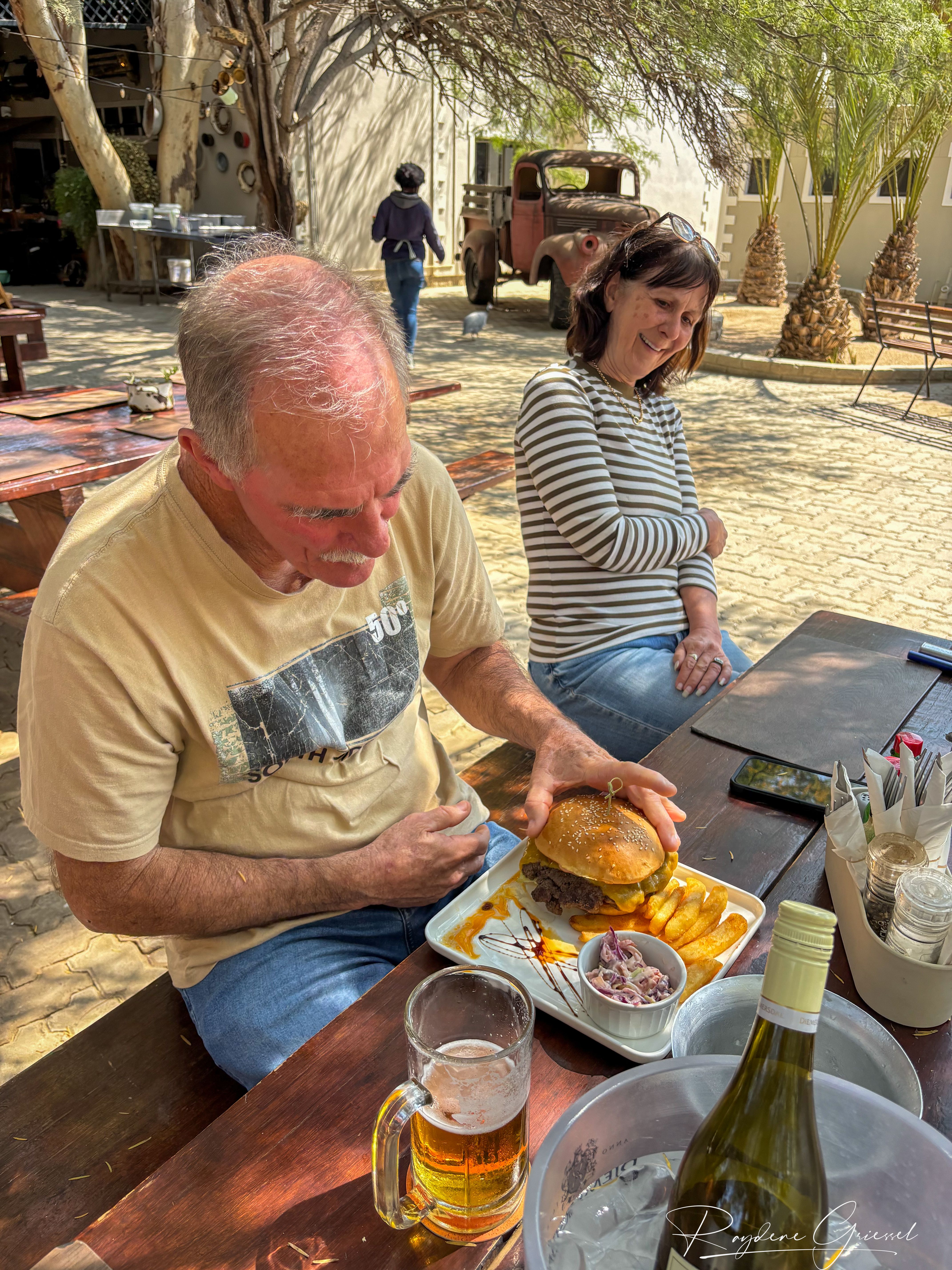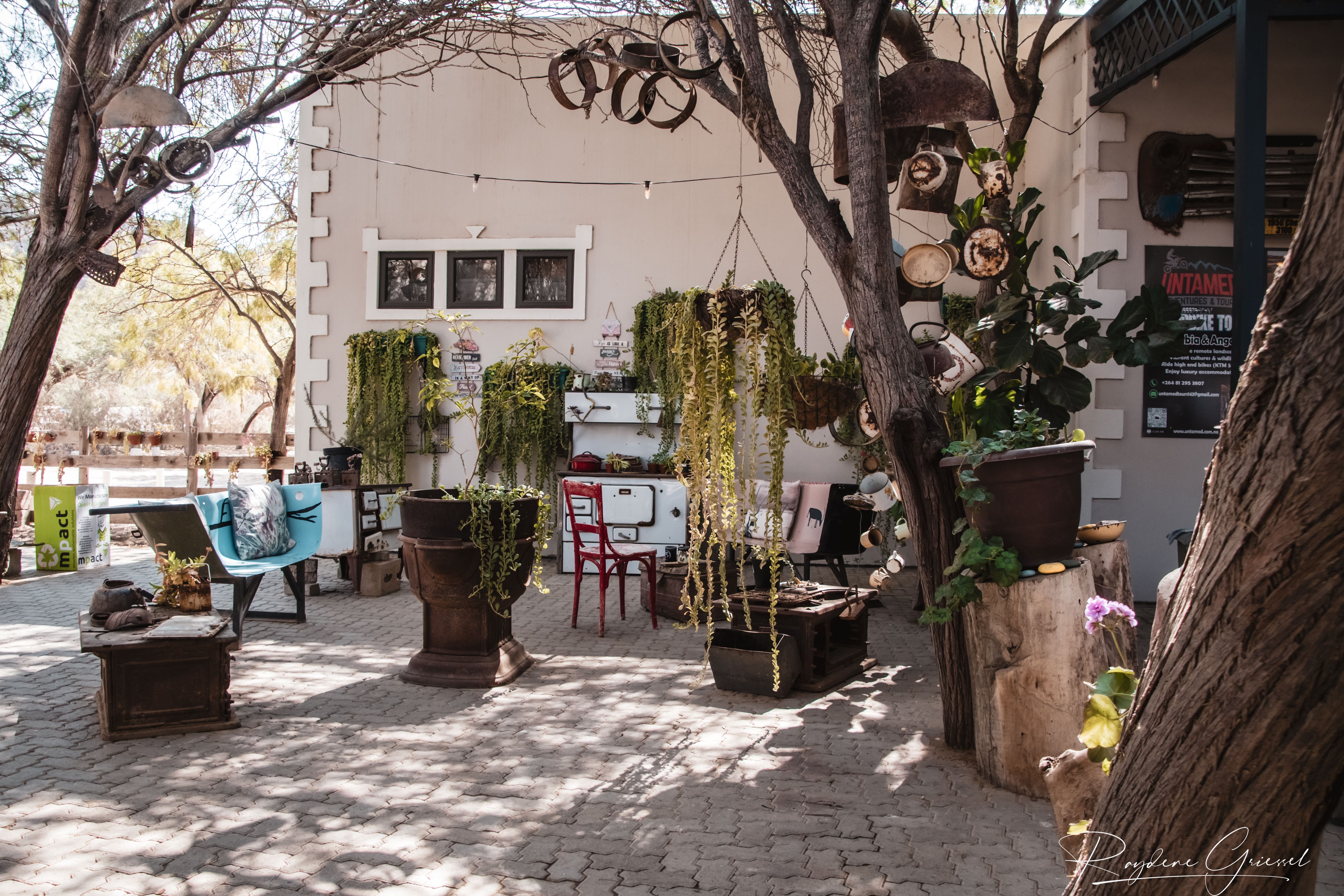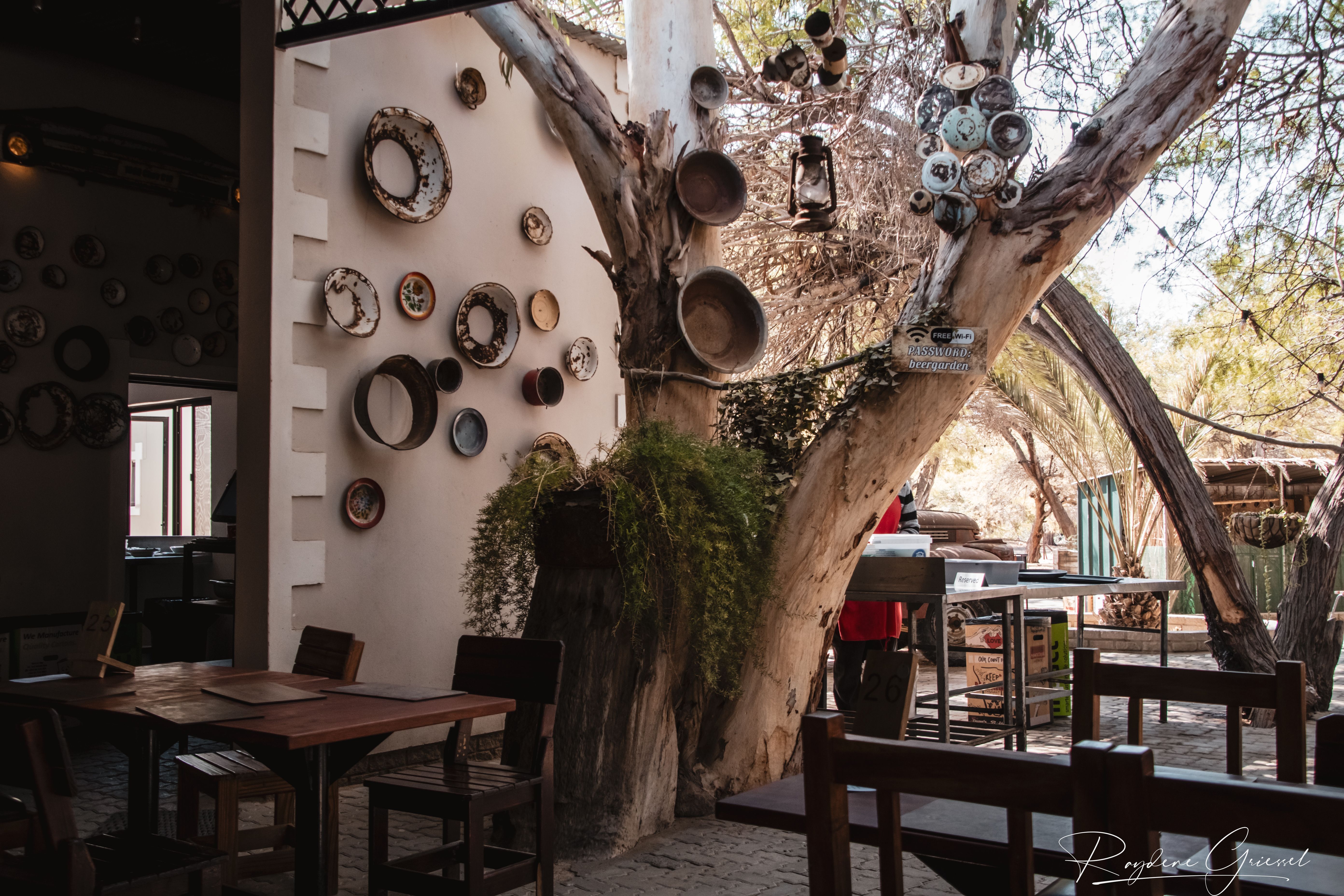 A short 12km detour north on a gravel track brought us to Goanikontes Oasis, a lush haven established in 1848. This historic farm, once a vegetable supplier for Swakopmund, sits like a mirage along the Swakop River amid the lunar terrain. Palm trees shade a natural swimming pool, and the restaurant serves homemade dishes like oxtail and eisbein, paired with cold draught beer—a welcome treat after dusty roads. We sat under acacias, spotting an array of birds & chickens, an eclectic assortment of decor makes this a must place to visit.